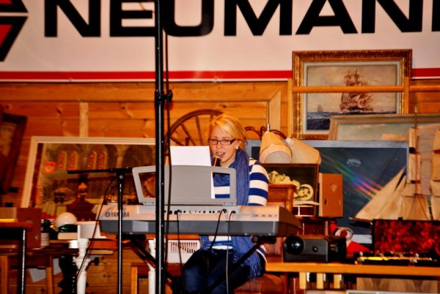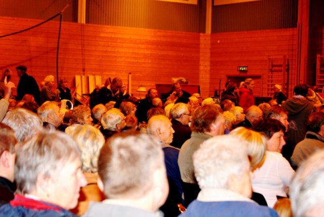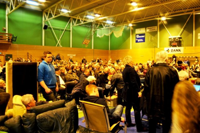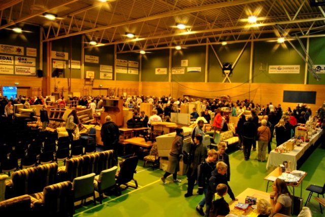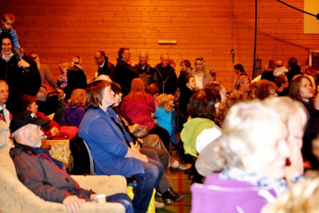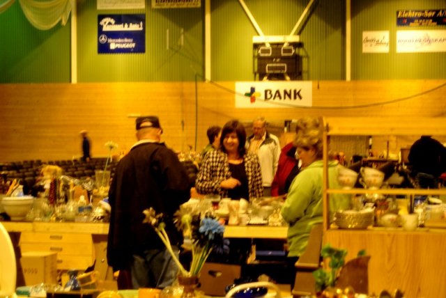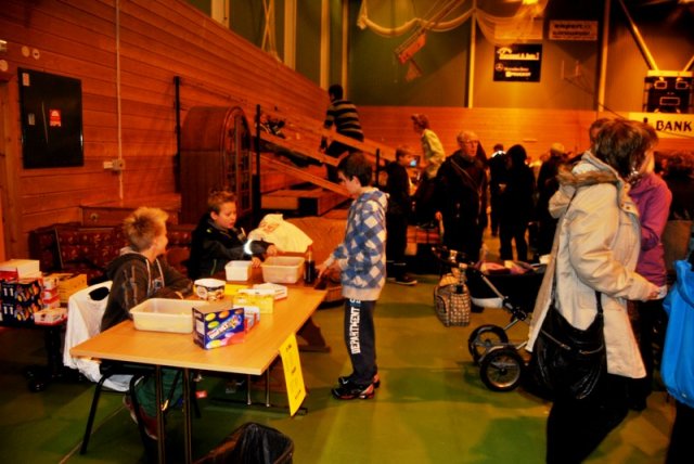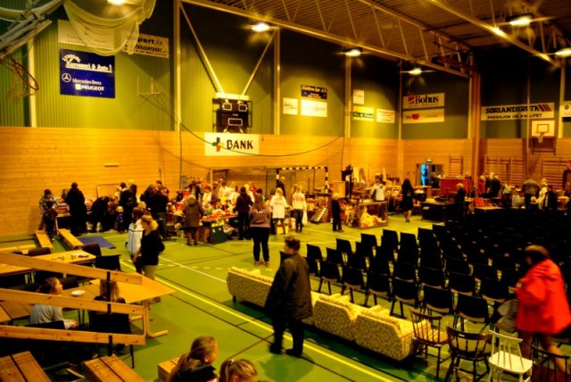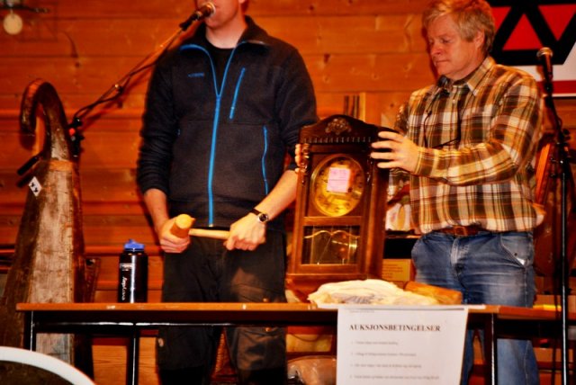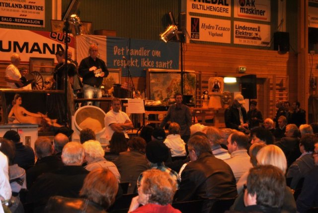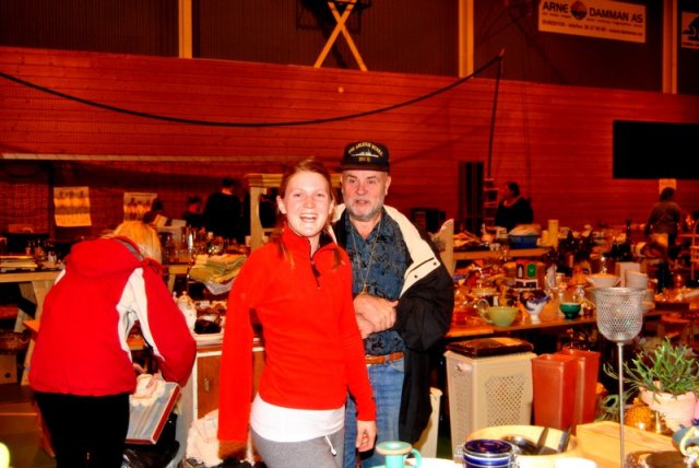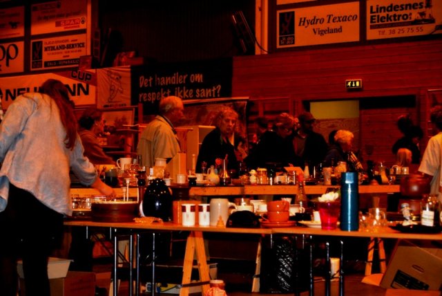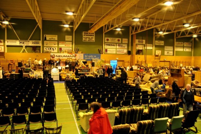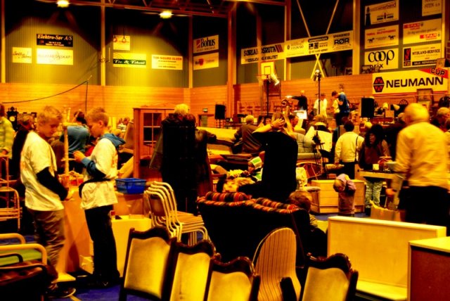 Das meiste, was hier stand, stammte von Haushaltsauflösungen und Spenden. Denn alles, was auf diesem Flohmarkt an Geld eingenommen wird, wird für die Jugendarbeit in Vigeland verwendet. Alle Verkäufer arbeiten hier ehrenamtlich. Die Attraktion auf diesem Flohmarkt ist die Versteigerung von ausgewählten Teilen. Dafür sind sehr viele Stuhlreihen im Saal aufgebaut worden und auf der Bühne waren die Sachen für diese Versteigerung bereits zum größten Teil aufgebaut. Überall waren die Leute und schauten sich die Sachen ganz genau an. Einige hatten einen Zettel dabei, wo sie sich Notizen machten. Die Aufregung war spürbar.