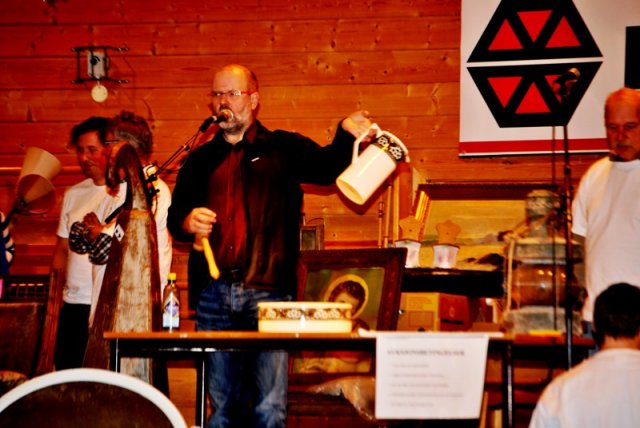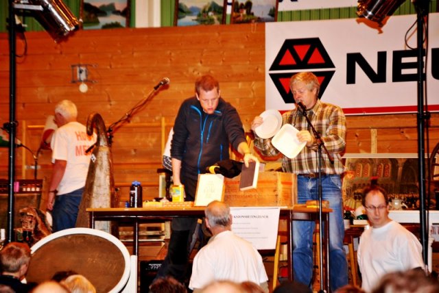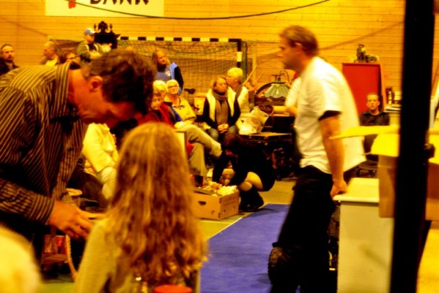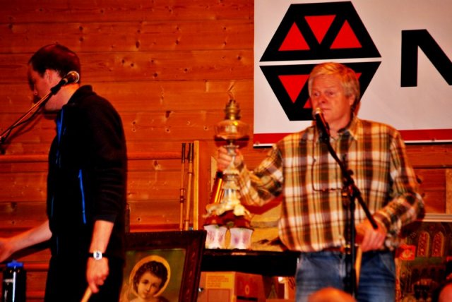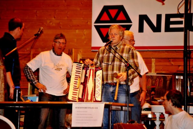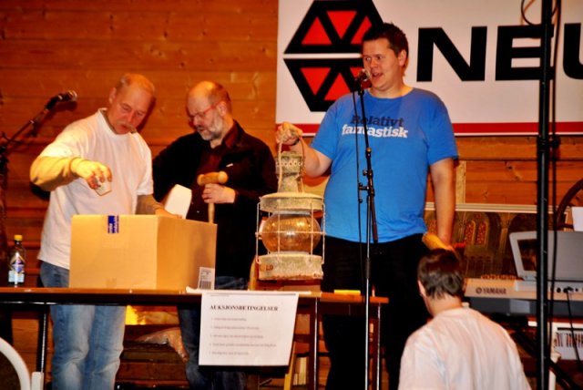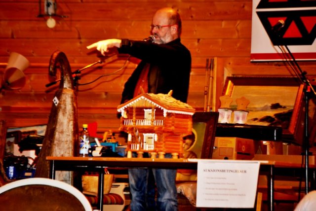 So gegen 17:30 Uhr war bei den beiden dann auch so langsam die Kondition am Schleifen. Die Bühne war fast leer. Es wurde noch eine alte Stalltür verkauft. Alte Bretter, zusammengenagelt mit einem alten Schloss. Für mich noch nicht einmal interessant für Feuerholz. Das Teil ging für über 2.000 Kronen weg.