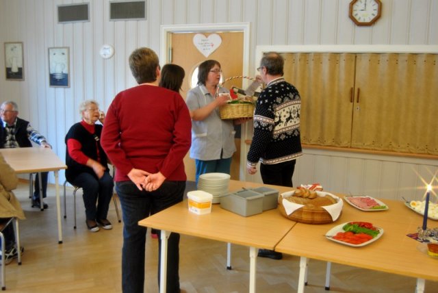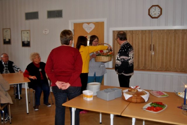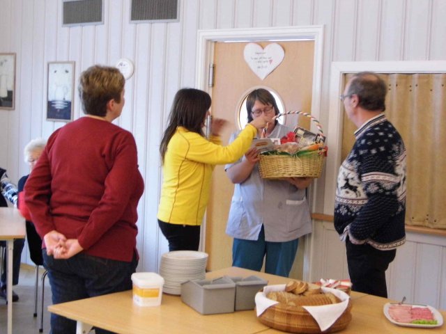 Dann ist es endlich 9.00 Uhr. Alle betreten den Frühstücksraum. Doch bevor es mit dem Essen losgeht, wird der Präsentkorb dem Küchenpersonal übergeben. Alle haben jeweils aus ihrer Region etwas Spezielles dazugetan. So wurde das eine runde Sache.