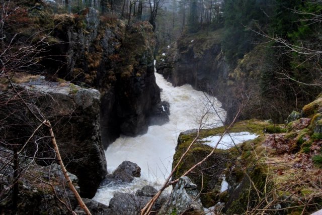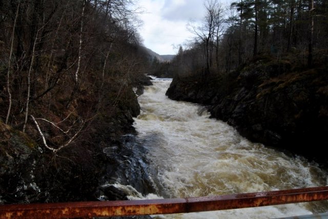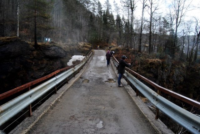Hier auf der Brücke, direkt über dem Wasserfall: